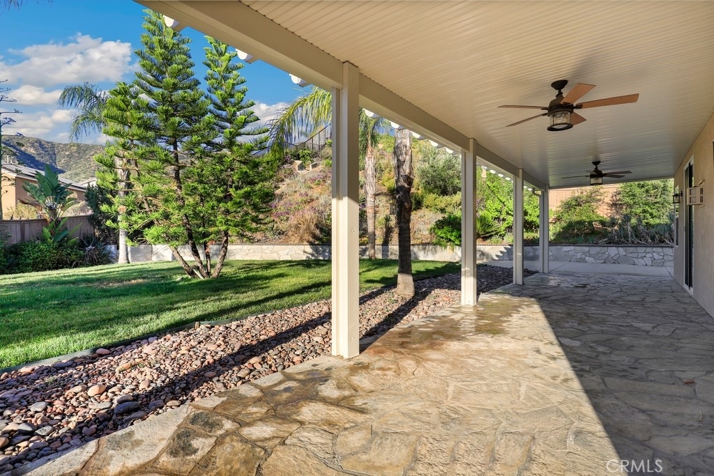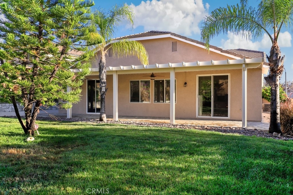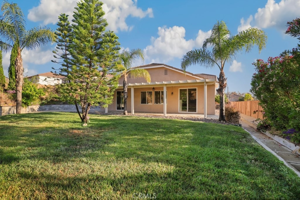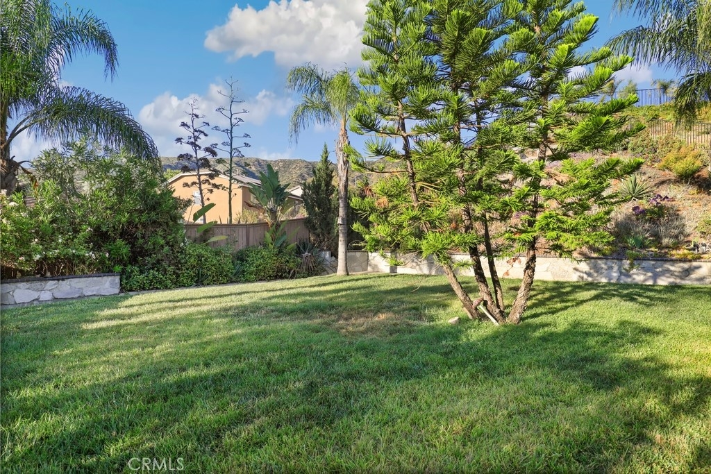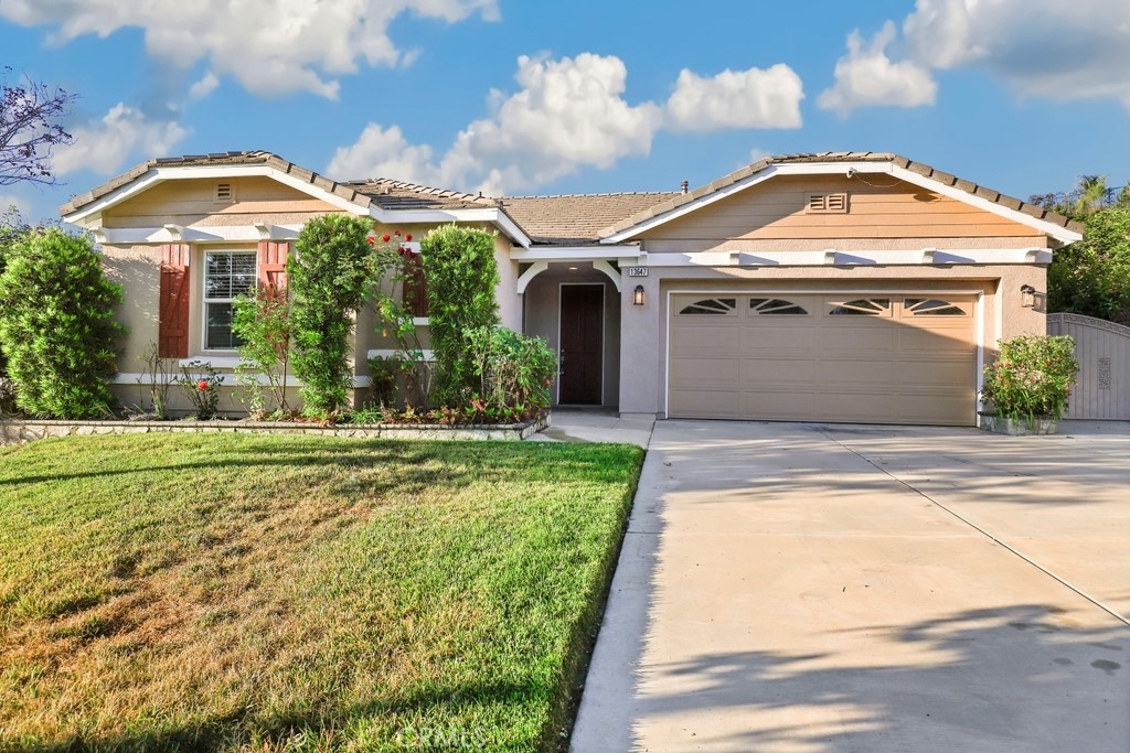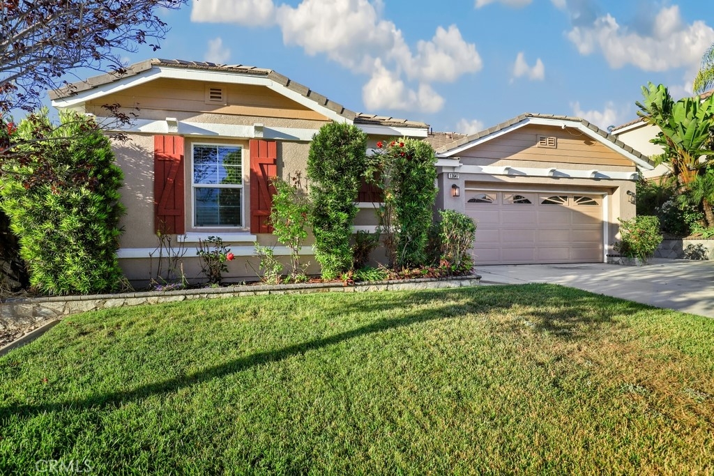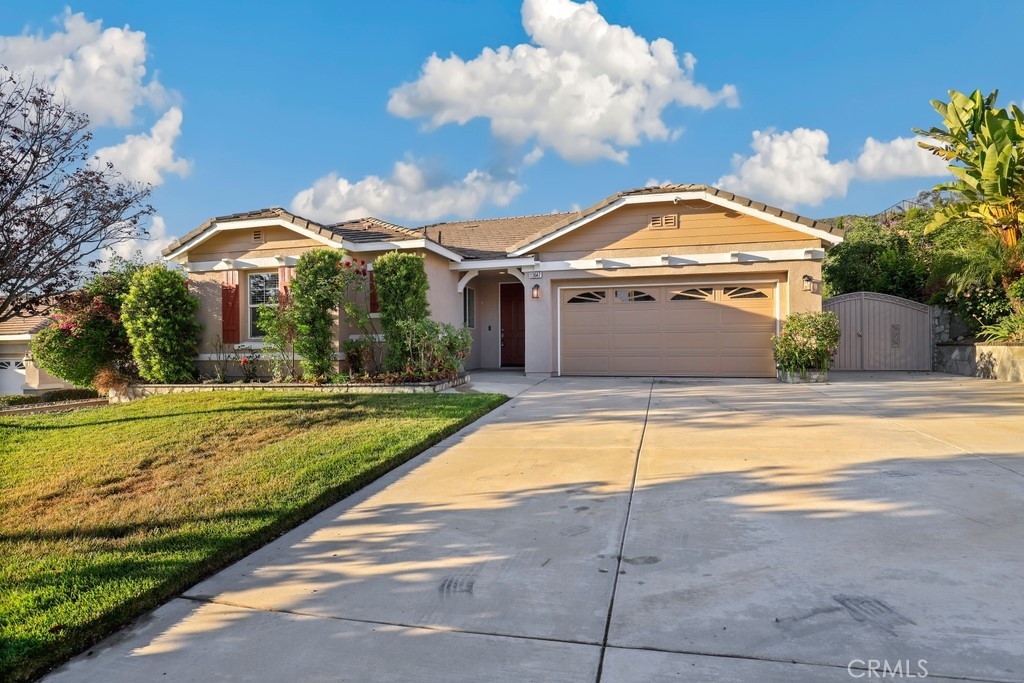 This gorgeous property is nestled within a beautifully landscaped setting. Immaculate mature landscaping greets you as you arrive, setting the tone for this well-maintained and move-in ready home. A convenient 2-car garage provides ample space for vehicles and storage in addition to RV parking. Enjoy the beauty and durability of wood-look tile flooring throughout the home, with plush carpeting in the bedrooms for added comfort. Modern light fixtures illuminate every room, enhancing the home's contemporary style. The formal living and dining areas offer a sophisticated space for entertaining guests. The open kitchen features an island with bar seating, granite countertops, stainless steel appliances, a 5-burner stove, and a spacious pantry. Relax in the family room with its floor-to-ceiling fireplace with a wood mantle, seamlessly connected to the dining area and opening to the outdoor patio through a glass slider. Go outside to the beautiful covered patio, complete with a ceiling fan, overlooking a park-like backyard. Mature trees, shrubs, and lush grass create a serene environment with stunning views of the hills. The spacious bedrooms provide ample room. The oversized primary suite features a wood accent wall, two walk-in closets, and a slider to the back patio. The ensuite bathroom boasts a dual sink vanity, soaking tub, and separate shower. A convenient laundry room is located off the garage entrance, making chores a breeze. Vaulted ceilings and abundant natural light throughout the home create an airy and inviting atmosphere. Close proximity to local parks with hiking trails, top-rated schools, the 15 freeway, and shopping centers. This stunning home combines luxurious living with practical amenities, making it the perfect place to create lasting memories. Don’t miss your chance to own this exceptional property!