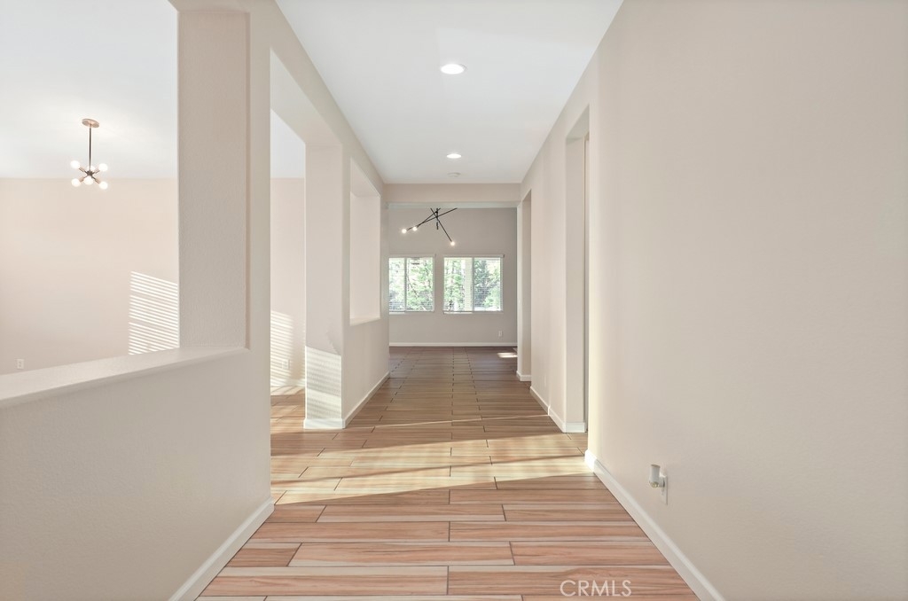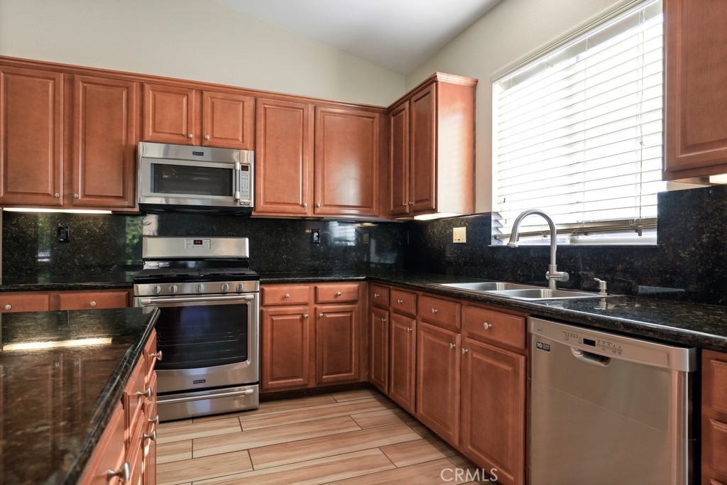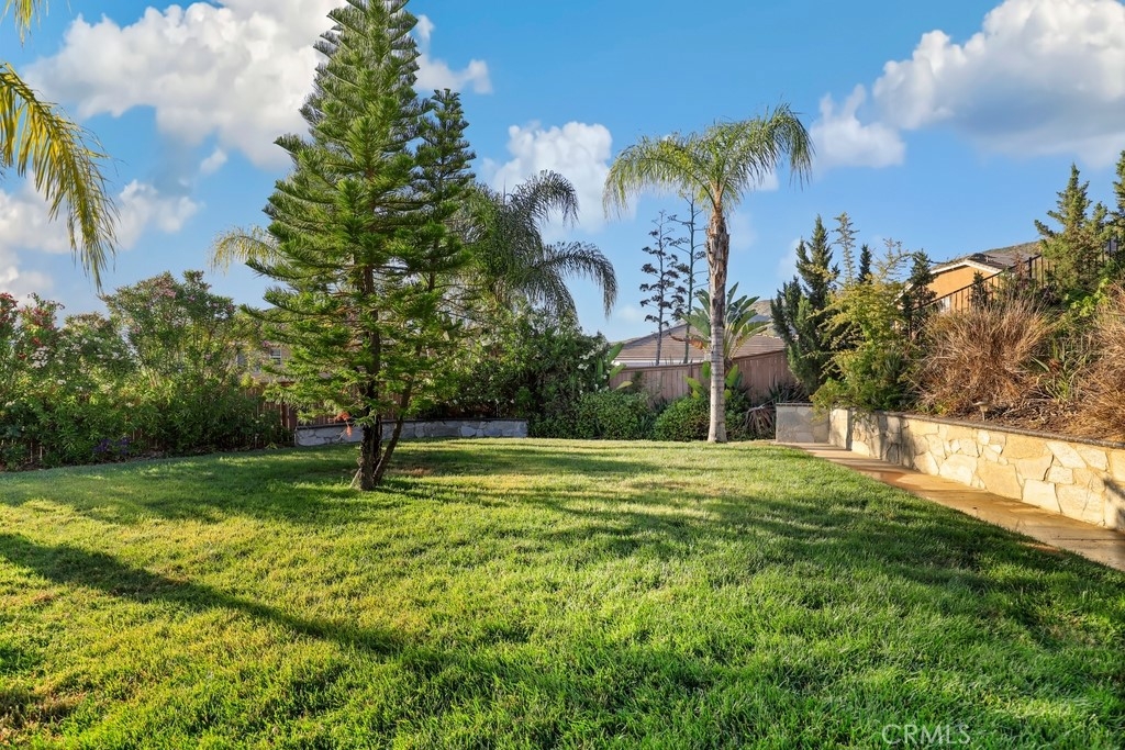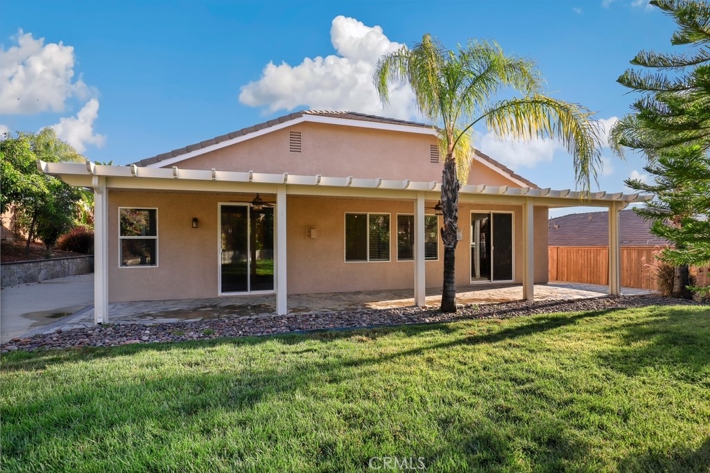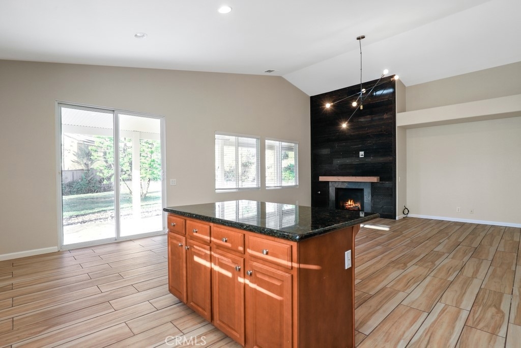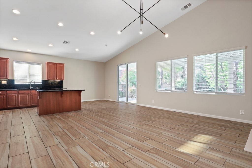 This gorgeous property is nestled within a beautifully landscaped setting. Immaculate mature landscaping greets you as you arrive, setting the tone for this well-maintained and move-in ready home. A convenient 2-car garage provides ample space for vehicles and storage in addition to RV parking. Enjoy the beauty and durability of wood-look tile flooring throughout the home, with plush carpeting in the bedrooms for added comfort. Modern light fixtures illuminate every room, enhancing the home's contemporary style. The formal living and dining areas offer a sophisticated space for entertaining guests. The open kitchen features an island with bar seating, granite countertops, stainless steel appliances, a 5-burner stove, and a spacious pantry. Relax in the family room with its floor-to-ceiling fireplace with a wood mantle, seamlessly connected to the dining area and opening to the outdoor patio through a glass slider. Go outside to the beautiful covered patio, complete with a ceiling fan, overlooking a park-like backyard. Mature trees, shrubs, and lush grass create a serene environment with stunning views of the hills. The spacious bedrooms provide ample room. The oversized primary suite features a wood accent wall, two walk-in closets, and a slider to the back patio. The ensuite bathroom boasts a dual sink vanity, soaking tub, and separate shower. A convenient laundry room is located off the garage entrance, making chores a breeze. Vaulted ceilings and abundant natural light throughout the home create an airy and inviting atmosphere. Close proximity to local parks with hiking trails, top-rated schools, the 15 freeway, and shopping centers. This stunning home combines luxurious living with practical amenities, making it the perfect place to create lasting memories. Don’t miss your chance to own this exceptional property!
