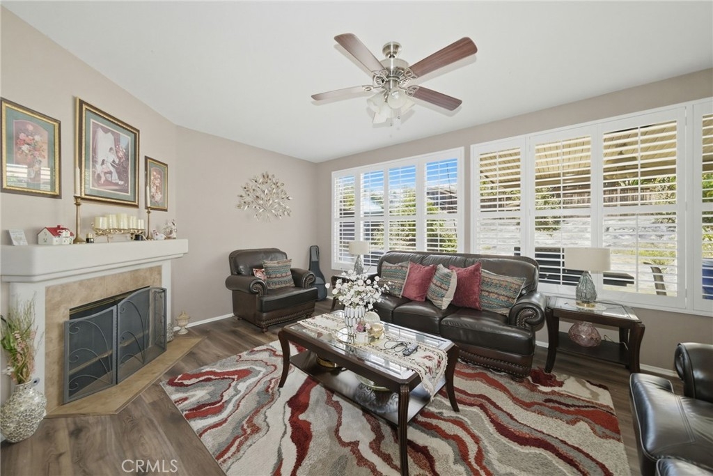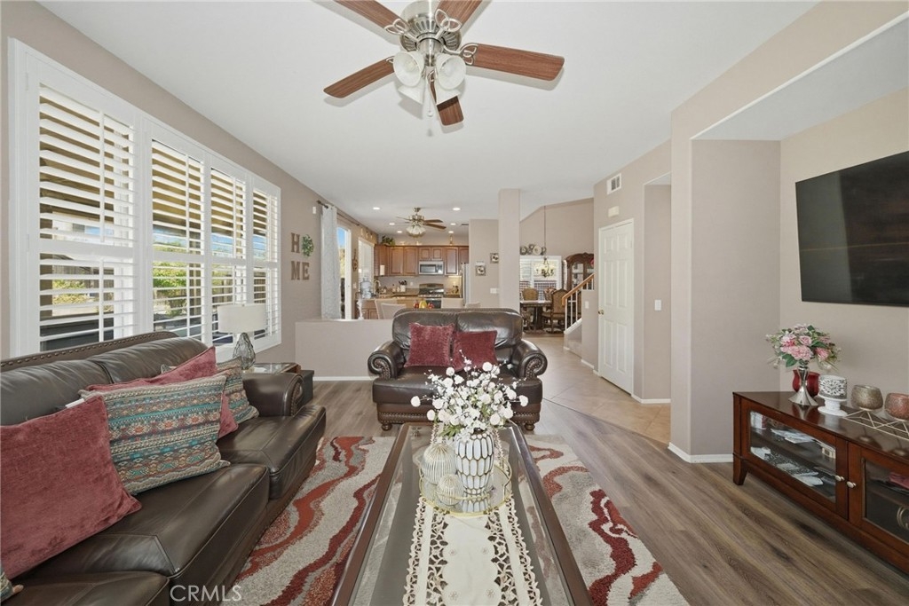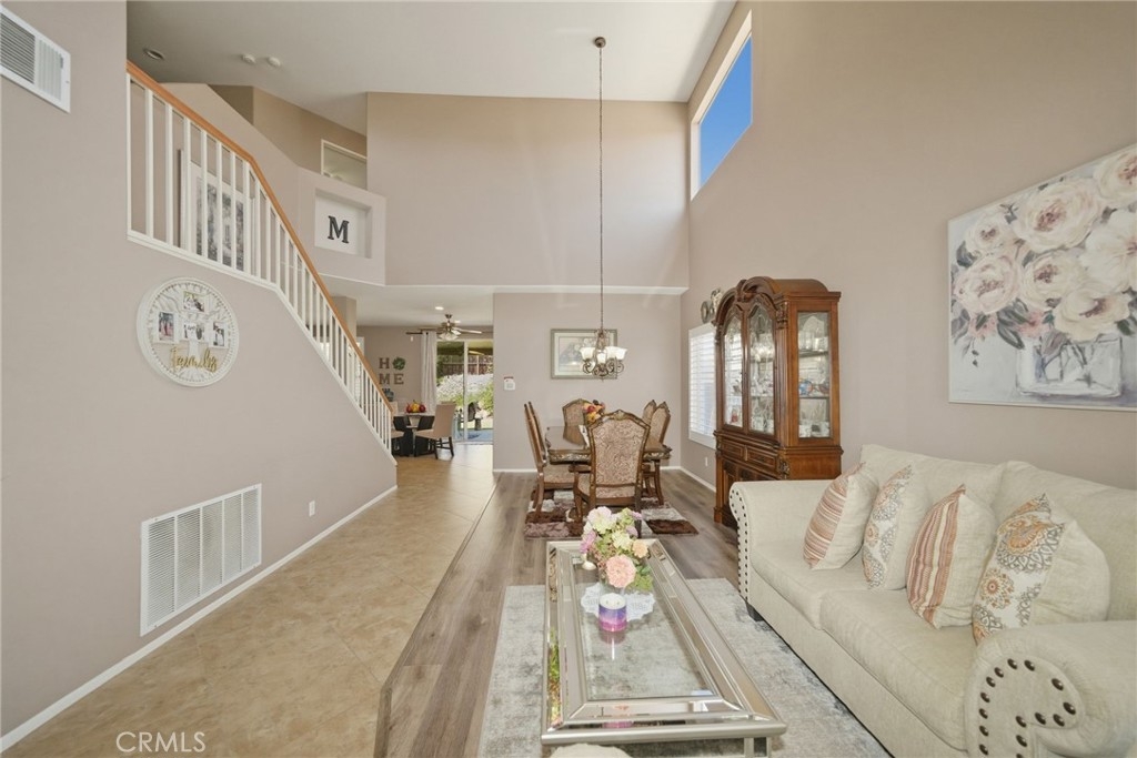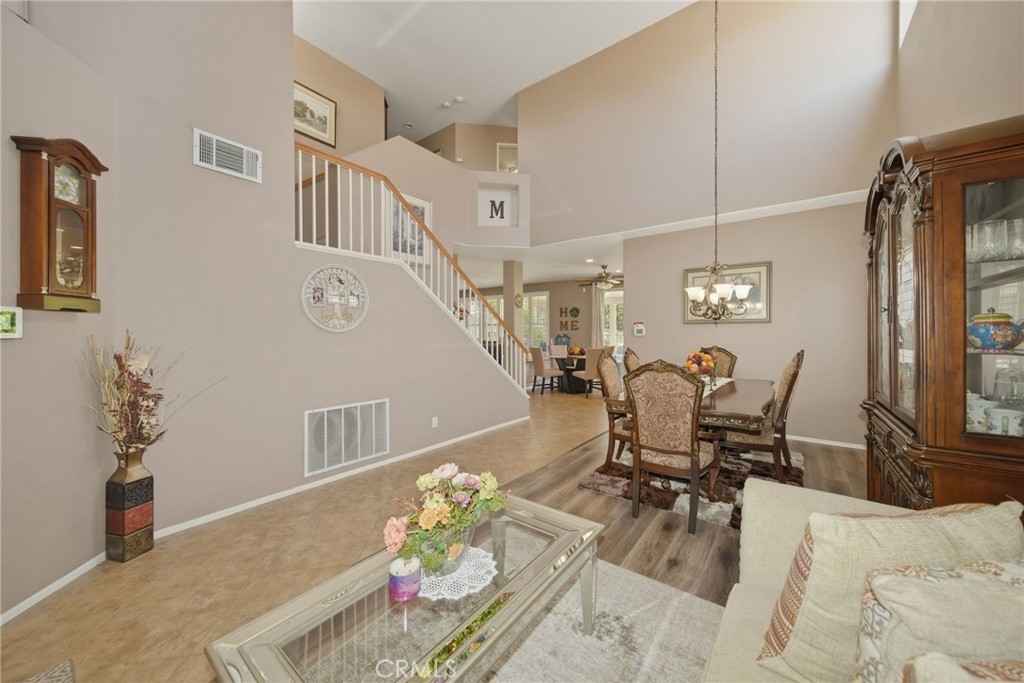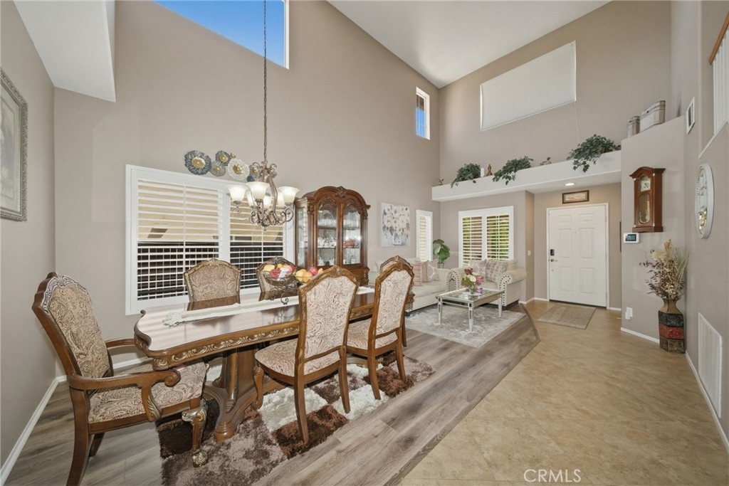 Welcome to this stunning two-story home located in the highly desirable Horsethief Canyon community of Corona, where comfort, style, and convenience come together beautifully. This thoughtfully designed residence features a three car garage with a highly sought-after downstairs bedroom and full bathroom—perfect for guests, in-laws, or multigenerational living. As you enter, you’ll be greeted by soaring double-height ceilings in the formal living and dining areas, creating an open and airy ambiance filled with natural light. An additional separate family room with a cozy fireplace offers the ideal space for relaxing or entertaining. The home is enhanced with elegant custom plantation shutters, durable laminate flooring, and a well-appointed kitchen featuring granite countertops. From the second floor, enjoy an impressive overlook into the main living spaces below, adding architectural charm and connectivity throughout the home. Upstairs, you’ll find three additional bedrooms, including a spacious and inviting primary suite complete with an en-suite bathroom, soaking tub, separate shower, dual sinks, and a generous walk-in closet. Step outside to your private backyard retreat, designed for both relaxation and low maintenance. Enjoy the Alumawood patio cover with ceiling fans—perfect for outdoor dining or lounging—along with artificial turf and a variety of mature fruit trees, including avocado, lemon, loquat, and orange. This tranquil outdoor space offers both privacy and natural beauty. Ideally located in a prime area within a highly regarded school district, this home also provides easy access to freeways, shopping, and dining—making everyday living a breeze. Residents of Horsethief Canyon enjoy exceptional community amenities, including a pool, spa, clubhouse, tennis courts, sports courts, and scenic picnic areas—all surrounded by picturesque natural landscapes. With a low HOA, you can enjoy resort-style living without compromise.